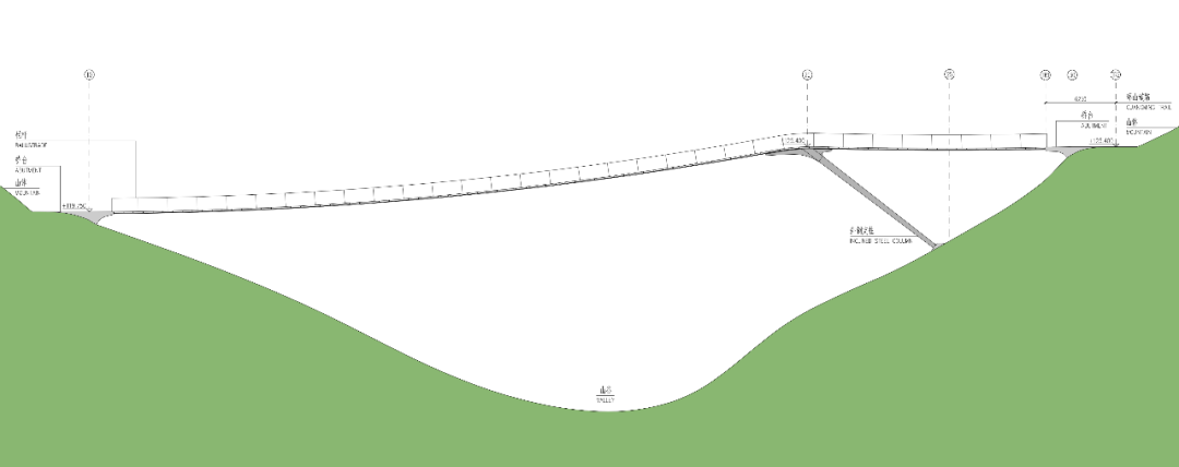 由于綠道場地上進出通道非常有限,沒有可能采用合適的重型機械來安裝懸橋。因此,包括懸帶在內的橋梁結構是由許多部件及鋼板現場拼接而成,以便于使用小型車輛來運輸。施工現場架設了臨時支架用于安裝鋼板帶,并使其滿足設定的弧度,然后通過拆除臨時支架來對鋼板帶預張拉,然后再安裝預制混凝土板,最后安裝橋梁附屬設施,如欄桿、燈具等。橋梁兩條懸帶的重要性不言而喻,為了使它們保持輕薄、簡潔,選用了Q690D高強度鋼板作為懸帶的鋼材。每道懸帶的截面尺寸是750mm*40mm,板帶被分作小段運送到施工現場,并在現場焊接到一起。這是中國首次在現場較大規模地焊接Q690D高強度鋼板。光明小鎮綠道的懸橋是中國第一座使用鋼板帶來受力的懸帶橋。盡管項目所處運輸條件惡劣,但鋼結構的施工質量達到了較為滿意的水準。最終所建成的橋梁輕盈地漂浮在山林地貌之上,體現了設計團隊對大自然環境和資源的高度尊重。橋梁的品質和創新得利于景觀建筑師對于在自然環境中建設的良好感知和認知;以及經過仔細推敲和研究而最終選定目前橋位和連接方式。此外,也得利于業主對這樣高科技橋梁建設的強烈意愿,以及總包單位和當地設計顧問等各方的努力。